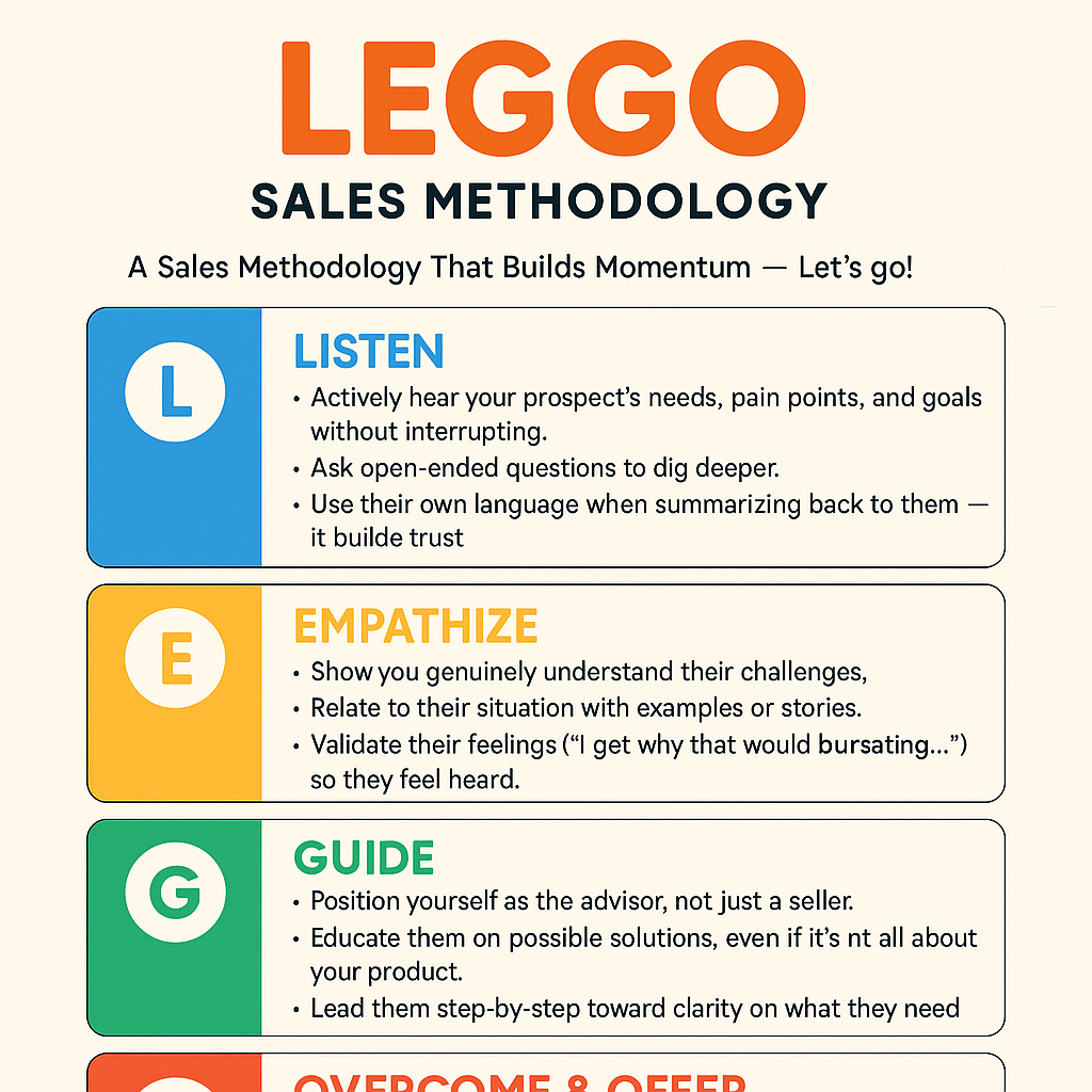 LEGGO stands for: Listen, Empathize, Guide, Generate Value, and Overcome & Offer. Let’s break down each step and see why it’s a game-changer for … [ Read the rest ?? ] “LEGGO: A Sales Methodology That Builds Momentum and Closes Deals”